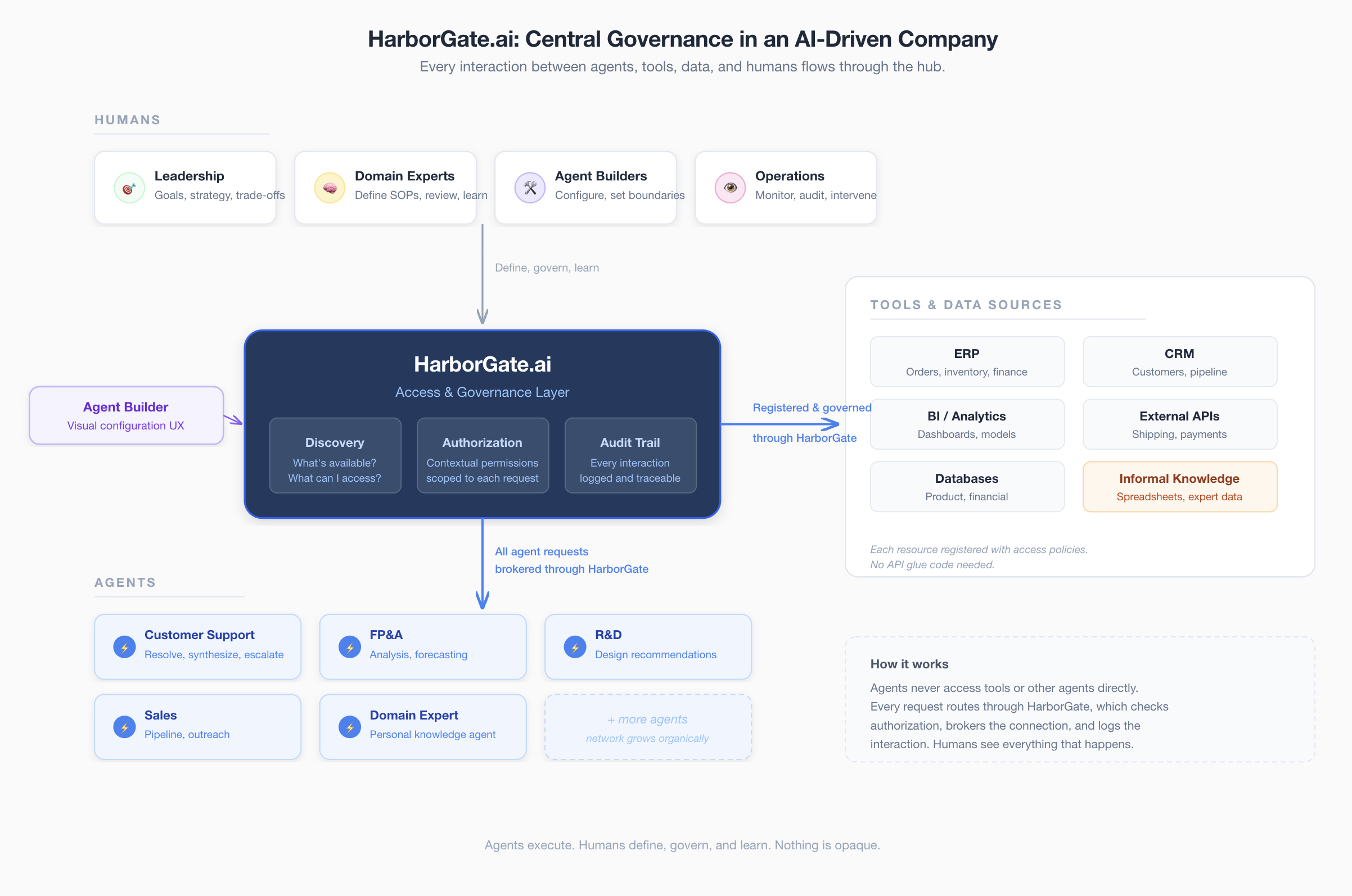Tools and data sources. APIs, databases, ERP endpoints, system integrations, and any structured data. These are predictable and don't need intelligence wrapped around them. They just need governed access. HarborGate registers them, manages who can call them, and logs every interaction. This includes human-contributed data: when a BI analyst wants to make their market model available to the network, they register it as a data source with access policies they define. No API needs to be built. The hub handles governance.